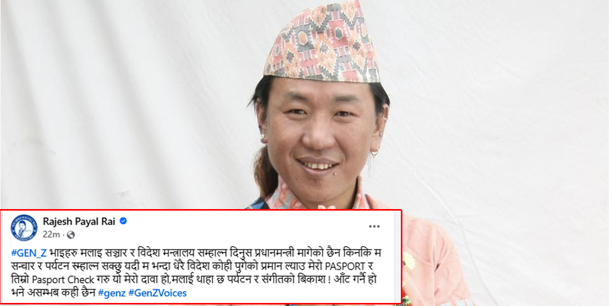 काठमाडौं । भदौ २७ , गायक राजेश पायल राईले जेनजी पुस्तालाई आफूलाई सञ्चार र विदेश मन्त्रालय दिन आग्रह गरेका छन् । अन्तरिम सरकारको चर्चा चलिरहेको बेला उनले सामाजिक सञ्जाल फेसबुकमा प्रधानमन्त्री नमागेको स्पष्ट पारेका छन् । तर, सञ्चार र पर्यटन सम्हाल्न सक्ने दाबी गरेका छन् ।