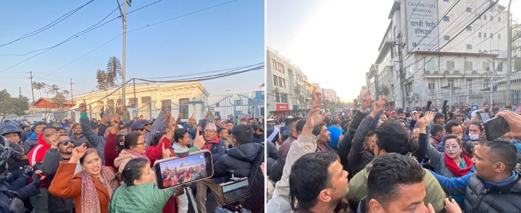 देउवा नेतृत्वको कांग्रेसको तर्फबाट तरुण दल अध्यक्ष विद्वान गुरुङसहित युवाहरू निर्वाचन कार्यालयअगाडि धर्ना दिँदै नाराबाजी गरिरहेका छन् ।